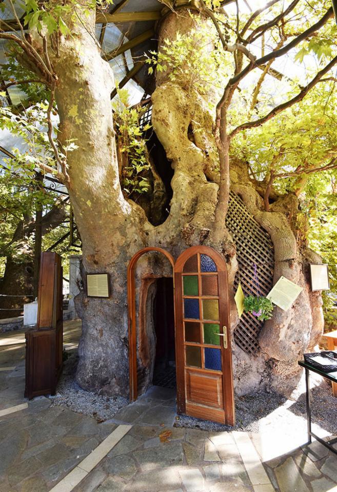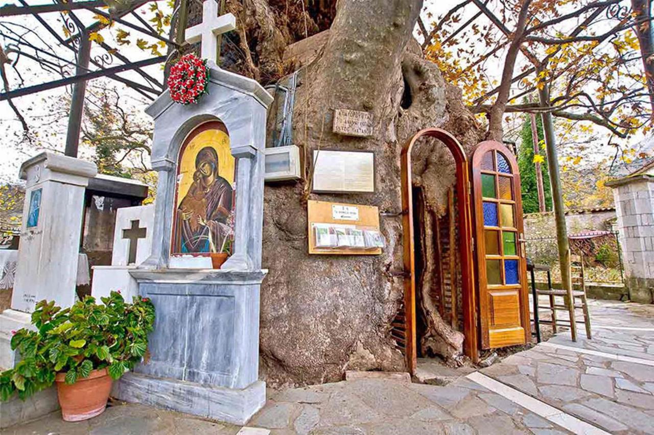 Ο μικρός αυτός ναός σχηματίστηκε μέσα στο κοίλωμα (κουφάλα) ενός τεράστιου, υπεραιωνόβιου πλατάνου ο οποίος προήλθε από την συνένωση τριών πλατάνων που φύτρωσαν μαζί, και με την πάροδο του χρόνου δημιούργησαν αυτό το αξιοθαύμαστο αριστούργημα της φύσης. Το ιστορικό αυτό πλατάνι έχει ύψος 25 μ. περίπου, περίμετρο στη βάση του 16 μ. και στο μέσο του 12,65 μ. και χωρά περίπου 20 προσκυνητές. Υπάρχει ένα μικρό τέμπλο, με δυο κίονες οι οποίοι σχηματίζουν την Ωραία Πύλη. Η εικόνα της Παναγίας Βρεφοκρατούσας ‘’αποτυπώθηκε’’ πάνω στο πλατάνι, στο εσωτερικό του κοιλώματος, όταν, σύμφωνα με την παράδοση, στα χρόνια της εικονομαχίας, οι μοναχοί του Μεγάλου Σπηλαίου, για να τη σώσουν, τη μετέφεραν από τόπο σε τόπο και έτσι διανυκτέρευσαν ένα βράδυ στο χωριό Κλαπατσούνα (όπως λεγόταν τότε), μέσα στο φυσικό κοίλωμα του πλατάνου. Το πρωί όταν πήραν την εικόνα για να συνεχίσουν το δρόμο τους είδαν έκπληκτοι το αποτύπωμά της στον κορμό του δέντρου, εκεί ακριβώς που την είχαν ακουμπήσει. Έτσι ονομάστηκε Παναγία η Πλατανιώτισσα και γιορτάζει στις 8 Σεπτεμβρίου.