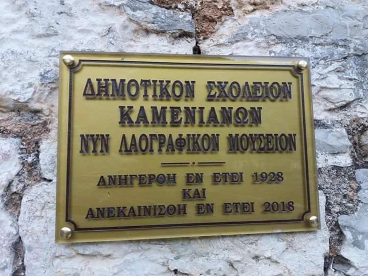 Σ’ αυτό το χώρο του Δημοτικού Σχολείου και νυν Λαογραφικού-Ιστορικού-Αρχειακού Μουσείου Καμενιάνων, στεγάζεται ο ψυχισμός μας. Εδώ ανοίξαμε τα μάτια μας αντίκρυ στον ήλιο και πρωτοείδαμε το φως της γνώσης που φώτιζε και φωτίζει τα σκοτάδια για το υπόλοιπο της ζωής μας. Στα κατοπινά χρόνια τούτος ο χώρος στεγάζει το ιστορικό παρελθόν και τις δράσεις των προγόνων μας, μεταφέροντας εκείνο τον προγονικό αντίλαλο ολοζώντανο μέχρι τις μέρες μας, σαν ένα γλυκό νανούρισμα που κοιμίζει τις αραχνιασμένες σκέψεις μέσα στης γαλήνης την βυζάχτρα αγκαλιά και τις μετατρέπει σε όνειρα κι ελπίδες για το αύριο.